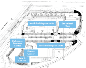The residential pads will total 274 upscale luxury apartments. The 1, 2, and 3 bedroom apartments will be in two separate buildings with private parking and a rooftop terrace.