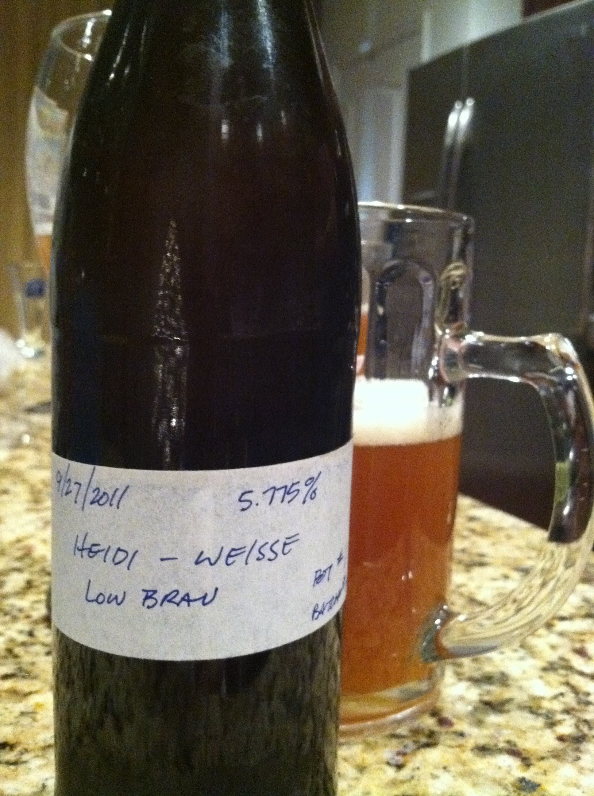 Low Brau’s flagship brew called the Heidi Weiss is a German style Weiss (wheat) beer (it’s named after Steve’s energetic Jack Russell, Heidi).  The Heidi is a session beer meant to be refreshing and in the lower alcohol range (falling somewhere in the 5% range, equivalent to an American Lager).  It has fruity and clove notes with a huge head that adds to the aromatics.  The Heidi is unfiltered, so it has a cloudy deep orange color with tiny effervescent bubbles resulting from champagne and weizen yeast.  It’s delicious, smooth, and hopefully coming to a tasting room near you soon.