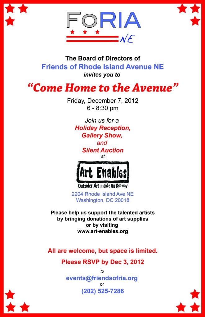 The Friends of RIA NE (FoRIA) are hosting the first “Come Home to the Avenue” event on Friday, December 7 from 6 – 8:30 PM. As part of this event to bring neighbors and friends together, they are hosting a Silent Auction with items donated from area businesses and others (in fact, the Rhode Island Insider is donating a Wine Basket!). The event is being held at Art Enables located at 2204 Rhode Island Ave NE, and as a thank you to Art Enables, the group is asking folks to support them by donating art supplies.