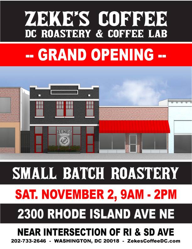 The Baltimore-based coffee roaster is about to open on Rhode Island Avenue within a few weeks (check out our earlier story on Zeke’s here). Zeke’s Coffee of DC has announced its Grand Opening on Saturday, November 2nd from 9am to 2pm at its new location at 2300 Rhode Island Ave NE, and is calling itself a “DC Roaster and Coffee Lab” — see flyer at bottom of this article. This small batch roaster will offer samples of their creations as they roast them, so you’re going to have to stop by often to see what they are brewing up next! The Insider stopped by Zeke’s and met up with its owner (and DC resident), John Kepner, to take a tour of the new space (and it’s handmade 12lb roaster).