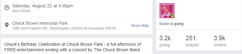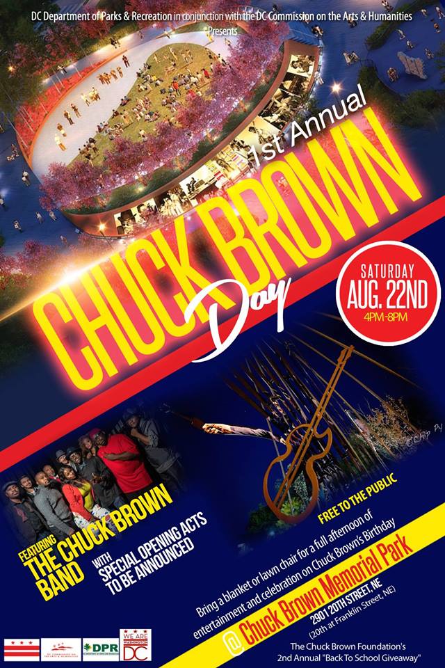DC Department of Parks and Recreation, along with the DC Commission on the Art & Humanities, wanted to have the 1st Annual Chuck Brown Day at the Chuck Brown Memorial Park. The ANC said “cool”. What the ANC and the residents around the small park that hosts the Chuck Brown Memorial didn’t anticipate was the 3,200+ people saying that they were going to attend the event, which is scheduled to be from 4-8pm, and host live bands.