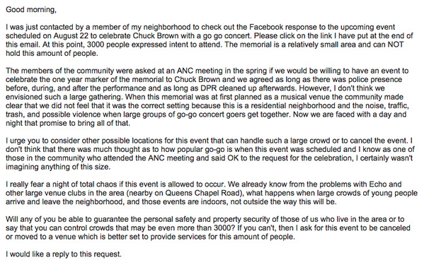fought against a larger Chuck Brown venue back when the memorial was first proposed, in order to avoid this kind of disturbance from occurring. Let’s be clear on my position (and many others): this is about the amount of people in this small area. Not a good idea for the people who live in the area and also not a good idea for people to enjoy themselves who do attend. I’m all for a memorial concert for Chuck Brown… but host it somewhere that can accommodate that many people. What do they have to say about it now? Here are a few comments from emails sent over to me, and to Popville: