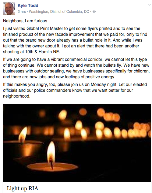 Kyle Todd, Executive Director of the RIA Main Street, had something stern to say about another instance of violence in the area: a bullet hole in the window of a newly completed facade improvement for a local business. See his post on Facebook below: